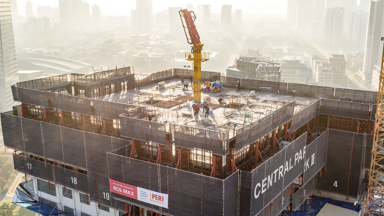 Due to the stricter guidelines of the South Korean government, safety was the top priority for all participants and processes. The RCS MAX Rail Climbing System was convincing the customer with decentralised hydraulic units that enabled all platforms to climb upwards synchronously. Potential sources of danger such as falling edges or falling parts were thus already excluded in the system. In addition, functions such as an automatic stop in case of overload or collision, a dead man's control with several remote controls as well as an emergency stop switch on each platform rounded off the multi-layered safety concept of the rail-guided climbing system.